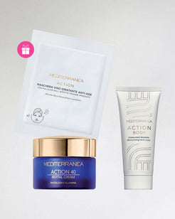 Un kit di prodotti per prendersi cura delle zone più esposte, viso e mani, regalando alla pelle una nuova radiosità. Action 40 Revital cream è un trattamento giorno e notte, dedicato alle pelli adulte che desiderano contrastare i primi segni del tempo. Grazie alla preziosa sinergia degli ingredienti attivi risveglia la bellezza della pelle giorno dopo giorno. Anche le mani sono importanti e hanno bisogno di attenzioni e cure, con Action body crema mani idratante l'idratazione è garantita. Arricchita da attivi lenitivi, idratanti e antiossidanti, utilizzata con costanza, screpolature e secchezza sono solo un ricordo! In omaggio, una maschera in tessuto monouso, Maschera viso idratante anti-age della linea Action per un "effetto bellezza" immediato. Nel tessuto è infuso una lozione arricchita da acido ialuronico e tetrapeptide per una pelle che appare più elastica e levigata. Incluso lo shopper per confezionare il tuo regalo.