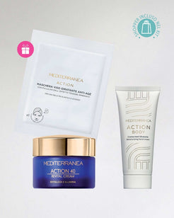 A kit of products to care for the most exposed areas—face and hands—giving skin a new radiance. Action 40 Revital cream is a day and night treatment designed for adult skin that wants to combat the first signs of aging. Thanks to the precious synergy of active ingredients, it revives the skin's beauty day after day. Hands are also important and require attention and care. Hydration is guaranteed with Action Body Moisturizing Hand Cream. Enriched with soothing, hydrating, and antioxidant active ingredients, with regular use, chapped skin and dryness are a thing of the past! A complimentary single-use sheet mask, the Action Anti-Aging Hydrating Face Mask, is included for an instant beauty boost. The sheet is infused with a lotion enriched with hyaluronic acid and tetrapeptide for skin that appears more elastic and smooth. Including a shopping bag to wrap your gift.