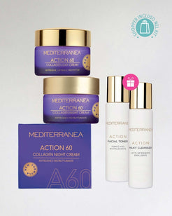 A day cream rich in innovative ingredients with anti-wrinkle, lifting, and protective properties. Their precious synergy helps slow down deep cellular aging by stimulating collagen and elastin synthesis, redefining facial features and improving skin texture. An anti-wrinkle and restructuring night face cream that optimizes the skin's natural nighttime repair process. Its active ingredients stimulate collagen and elastin synthesis, combating sagging skin and reducing the appearance of wrinkles, while protecting cells from oxidative damage. Your beauty allies that accompany you throughout the day, day after day, your skin will be as if nourished from within. The Action cleansing mini-size kit (cleansing milk and toner) is included as a free gift. Including a shopping bag to wrap your gift.