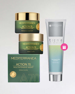 La crema viso giorno assicura un'azione idratante, ridensificante e protettiva ad una pelle che con il passare del tempo ha perso alcuni nutrienti essenziali. Contrasta il rilassamento cutaneo, la disidratazione e l'iperpigmentazione. É un'alleata di bellezza quotidiana dalla texture ultra-confortevole che regala nuova radiosità alla pelle. La crema viso notte aiuta a rinforzare la barriera cutanea, dando tono e sostegno, nutrendo in profondità la pelle per regalare al risveglio una pelle morbida e distesa. Grazie alla selezione accurata di ingredienti attivi, favorisce il ricambio cellulare contrastando l'accumulo di melanina e limita la perdita di alcuni nutrienti essenziali coinvolti nel mantenimento dell'elasticità e della tonicità cutanea. Compreso nel prezzo il Trattamento Mani Terme dalla potente azione ristrutturante. Incluso lo shopper per confezionare il tuo regalo.