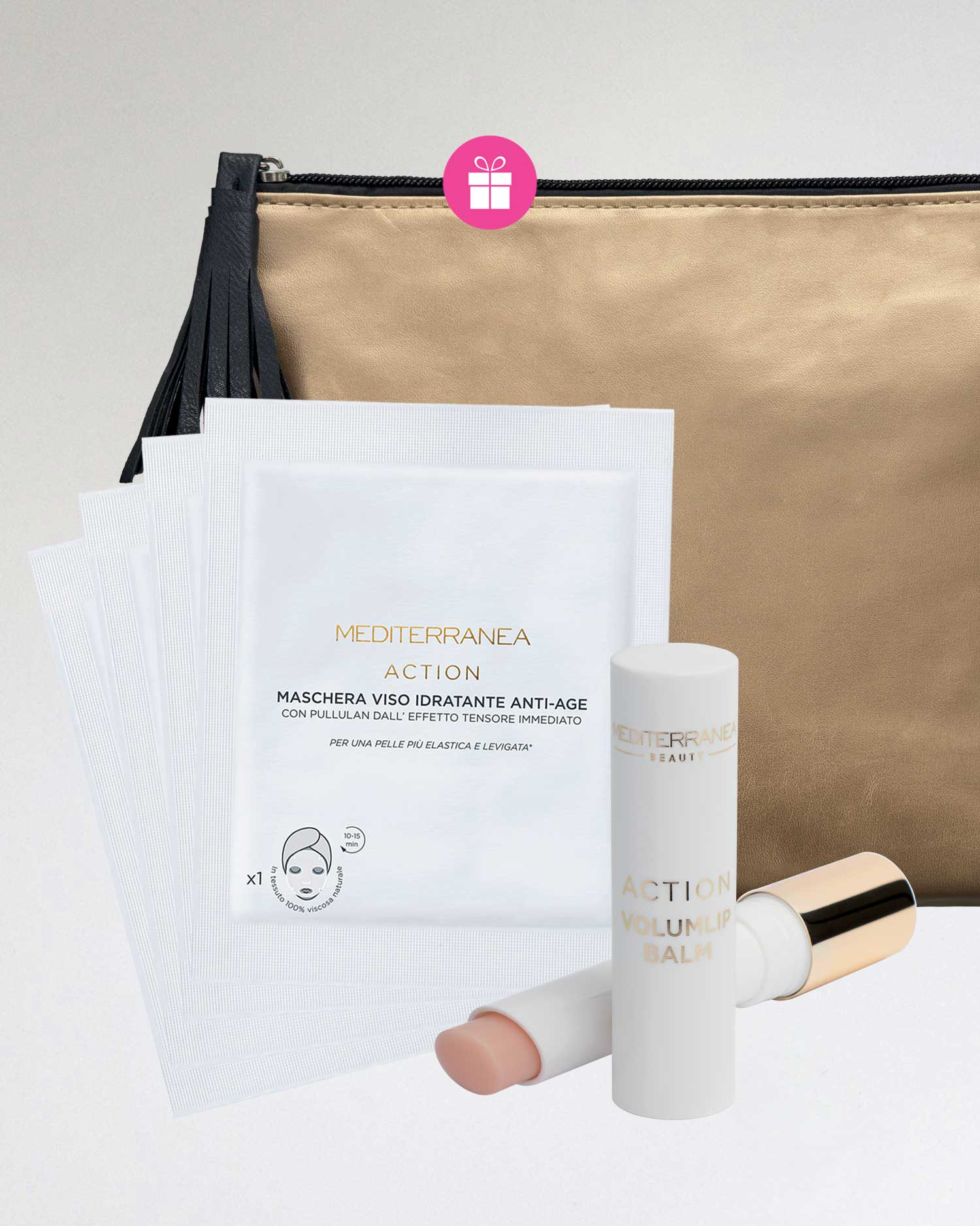 Un kit di prodotti da regalare o regalarsi per donare alla pelle del viso un booster di idratazione e freschezza per una bellezza raggiante. Contiene un kit di maschere monouso in tessuto arricchite da una lozione che contiene acido ialuronico e tetrapeptide per garantire un'azione altamente idratante e levigante, attenuano i segni di stanchezza per una pelle visibilmente più elastica e radiosa dopo ogni applicazione. Per prendersi cura anche delle labbra Action Volumlip balm, è un balsamo labbra che ammorbidisce esaltando il naturale colore delle labbra donando un effetto volumizzante dopo ogni applicazione. In omaggio una trousse dorata dove conservare i prodotti beauty. Incluso lo shopper per confezionare il tuo regalo.
