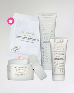 Un kit speciale corpo dalla detersione al trattamento per regalare una vera coccola. Action body Shampoo doccia, ideale per tutta la famiglia garantisce una detersione delicata di corpo e capelli. Arricchito da uno zucchero naturale che aiuta a preservare l'idratazione e un profumo agrumato vanigliato lascerà sulla pelle una sensazione di dolce vitalità. Action body Crema corpo effetto seta è caratterizzata da una texture particolarmente soffice e spumosa che idrata e avvolge la pelle in una nuvola di profumo delicato alla rosa. Un'esperienza sensoriale per la pelle del corpo per concedersi un momento di relax. Per la cura delle mani Action body Crema mani idratante che attenua screpolature e secchezza per una pelle sempre morbida e idratata. In omaggio, una maschera in tessuto monouso, Maschera viso idratante anti-age della linea Action per un "effetto bellezza" immediato. Nel tessuto è infuso una lozione arricchita da acido ialuronico e tetrapeptide per una pelle che appare più elastica e levigata. Incluso lo shopper per confezionare il tuo regalo.