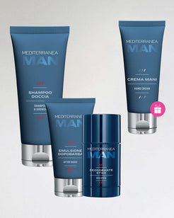 Un kit di prodotti pensati per le esigenze quotidiane di una pelle maschile: Man Shampoo doccia, Man Deo stick e Man Emulsione dopobarba. Compresa nel prezzo Man Crema mani. Lo shampoo doccia è pensato per lavaggi frequenti, nasce per rispettare il film idrolipidico della pelle e la naturale struttura del capello. Il Deo stick per garantire freschezza tutto il giorno e l'emulsione dopobarba, è un trattamento dopobarba senza alcol che dona un immediato sollievo alla pelle del viso dopo la rasatura. Incluso lo shopper per confezionare il tuo regalo.