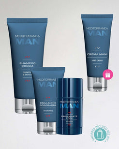 A kit of products designed for the daily needs of men's skin: Man Shower Shampoo, Man Deo stick and Man Aftershave Emulsion. Man Hand Cream included in the price. The shower shampoo is designed for frequent use and is designed to respect the skin's hydrolipidic film and the natural structure of the hair. The deodorant stick ensures all-day freshness, and the aftershave emulsion is an alcohol-free treatment that provides immediate relief to facial skin after shaving. Including a shopping bag to wrap your gift.