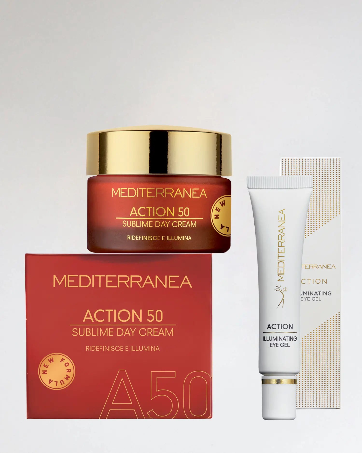 Action 50 Sublime day cream è un trattamento viso antirughe ridensificante che soddisfa le particolari esigenze di una pelle indebolita dai cambiamenti ormonali legati all'età. Idrata, nutre e contrasta la perdita di tono. Un'alleata indispensabile per una pelle più elastica, levigata e compatta. Per prendersi cura della zona del contorno occhi troverai Action Illuminating eye gel, un prodotto in gel ricco di principi attivi accuratamente selezionati che agiscono in sinergia esercitando un'azione decongestionante, schiarente, idratante e lenitiva; attenua e contrasta il fastidioso inestetismo di borse e occhiaie per uno sguardo più disteso e riposato.