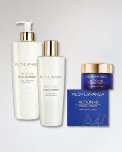 Un kit di prodotti pensati per una perfetta beauty routine. Per la detersione, Action Milky Cleanser, un latte detergente emolliente dalla texture fluida ma ricca che rimuove impurità lasciando la pelle morbida e vellutata. Compreso nel prezzo del kit, Action Facial Toner, uuna lozione tonificante che rimuove i residui del latte detergente lasciando la pelle rivitalizzata. Grazie alla presenza di estratti glicolici di fiori e frutta e acido glicolico assicura una microesfoliazione delicata uniformando l'incarnato. Action 40 Revital cream, una crema viso all day, giorno e notte dall'azione idratante e rivitalizzante che aiuta a contrastare i primi segni del tempo grazie alla presenza del ribosio "lo zucchero della bellezza" e l'acido ialuronico.